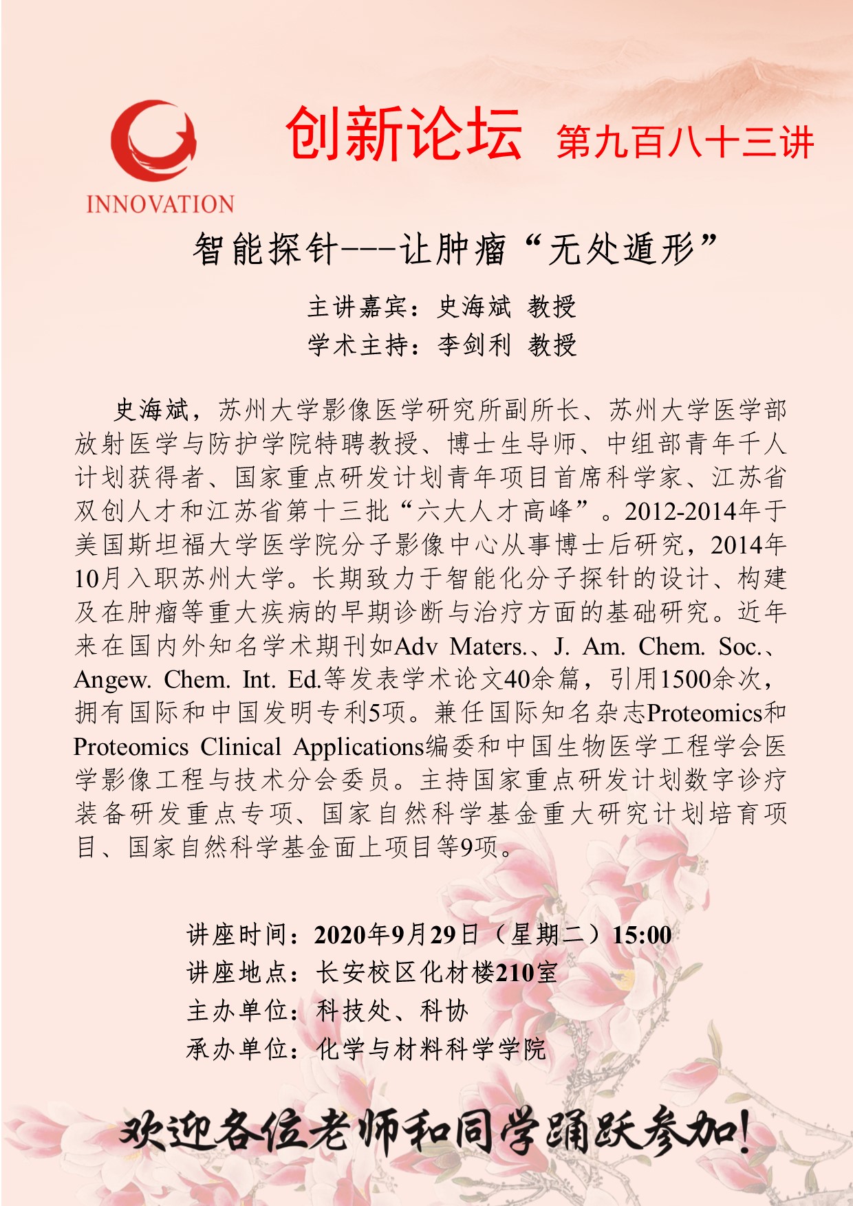 史海斌 教授 安博·(中国)体育官方网站创新论坛第九百八十三讲:智能探针---让肿瘤“无处遁形” 讲座时间 2020年9月29日(星期二)15:00 讲座地点 长安校区化材楼210室 讲座人介绍 史海斌 教授 讲座内容