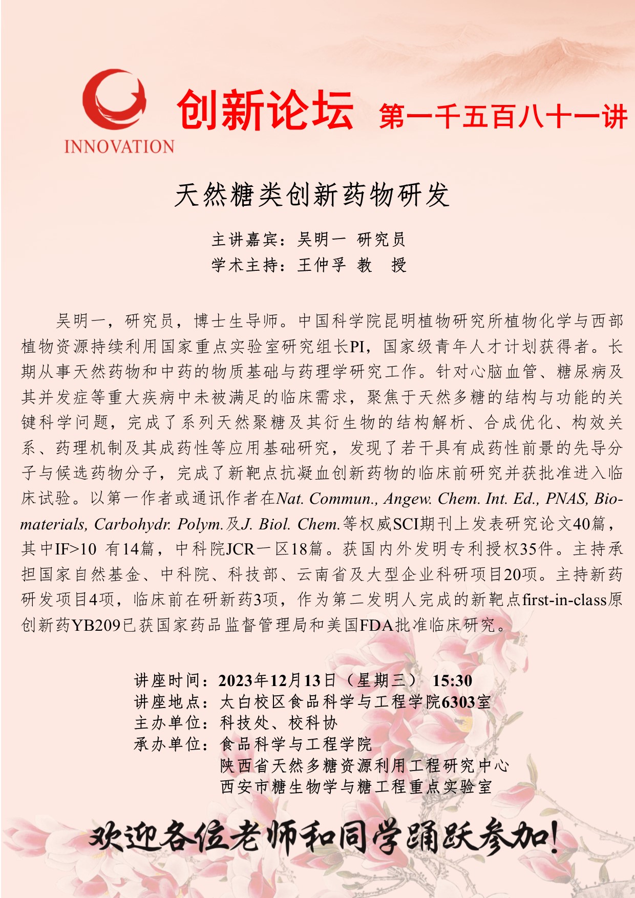 吴明一 研究员 安博·(中国)体育官方网站创新论坛第一千五百八十一讲:天然糖类创新药物研发 讲座时间 2023年12月13日(星期三) 15:30 讲座地点 太白校区食品科学与工程学院6303室 讲座人介绍 吴明一 研究员 讲座内容